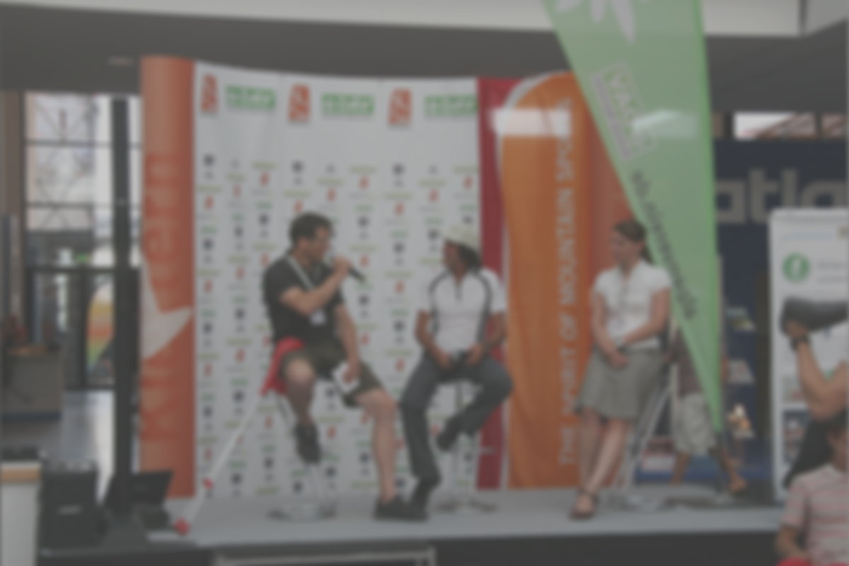 Foto © Birgit Gelder: Olaf im Gespräch mit Hans Kammerlander auf der OutDoormesse in Friedrichshafen.